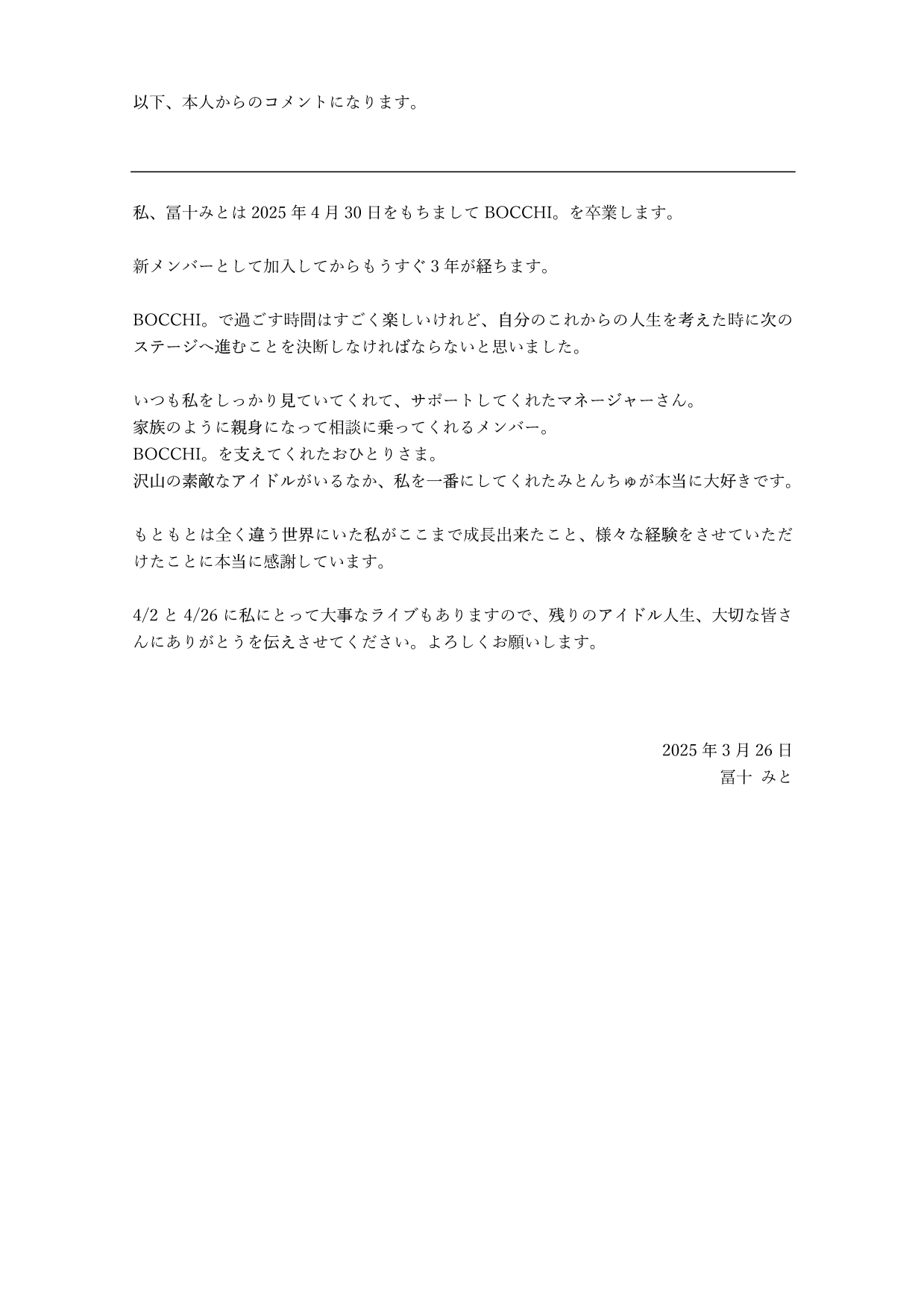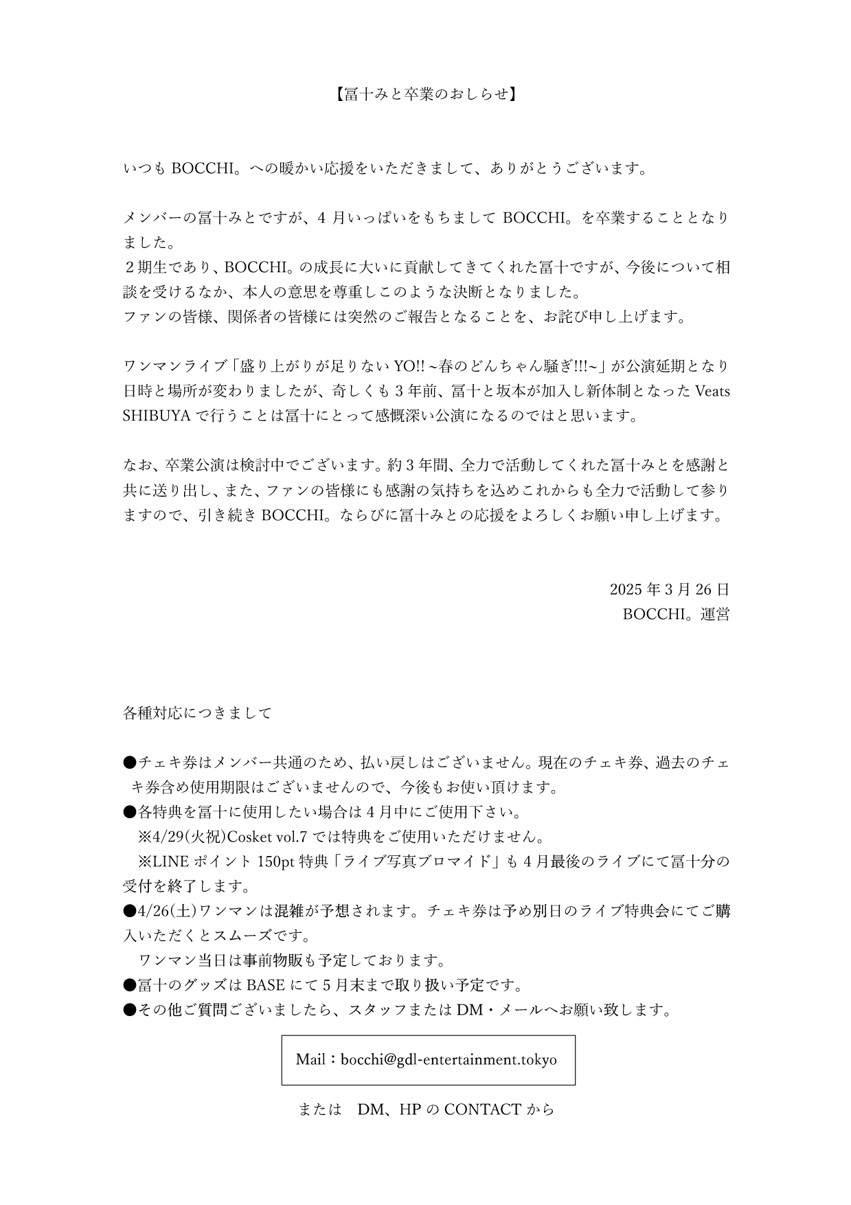 NEWS 2025.03.26 [Wed] 【BOCCHI。より大切なおしらせ】 4月いっぱいを持ちまして、冨十みとが卒業いたします。 4/2ソロライブ、4/26Veatsワンマンをはじめ、全ての活動を全力で駆け抜け冨十を送り出します。 ぜひご一読下さい。 BACK